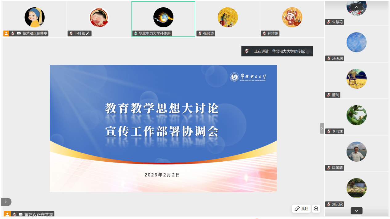 围绕如何做好大讨论宣传工作,孙传新提出三点要求:一要提高政治站位,锚定“为党育人、为国育才”,聚焦人才培养改革核心议题,立足能源电力特色彰显华电办学特质。二要聚焦重点任务,分层分类精准宣传,创新传播方式构建全媒体矩阵,挖掘典型案例强化示范引领。三要强化协同发力,压实责任、务求实效,推动宣传与讨论实践融合,凝聚“一盘棋”工作合力。他要求各单位以高度的政治自觉、思想自觉和行动自觉,扛起宣传重任,让大讨论的声音传遍校园,形成“人人关心教育教学、人人参与改革创新”的生动局面。