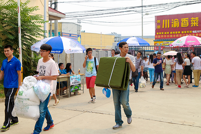 在北京校部的教学楼四号楼与三号楼中间,各院系纷纷设置红色帐篷,有序排成长队,并在各自院系帐篷前拉开绳索稳定秩序以便新生咨询与报到,帐篷下各个学院的接待人员忙得热火朝天,更有席地而坐的学长用打印机现场打印图纸。电气与电子工程学院在承办运动会时的吉祥物黄色的“小电鸡”萌倒众新生,人们按捺不住激动的心情纷纷跑上去抱住“小电鸡”合影留念;在系列帐篷前写着“家长止步”的标志牌前,家长们望着远处正在报到的孩子,满怀不舍与期待;由自管会主板的“爱心驿站”为新生免费发放书籍和生活用品,许多人在细细挑选毕业生留下的“新”衣服,自管会周到的服务吸引了不少来往行人;校学生会的宝贝熊闻“乐”起舞,为原本热闹的画面更添无限欢乐;人文院11级、14级辅导员马冬拄着拐杖,带伤迎接新生;失物招领处与后勤服务集团等组织也加入接待队伍,尽心服务新生……
