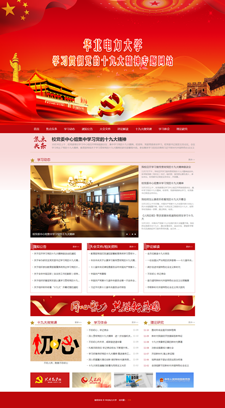 专题网站在大学主页设有专题专栏,点击大图或主页右下角的“专题网站”进入链接,也可直接登陆访问http://shjd.ncepu.edu.cn/,全面获取学习贯彻十九大精神的动态信息和有关资讯。