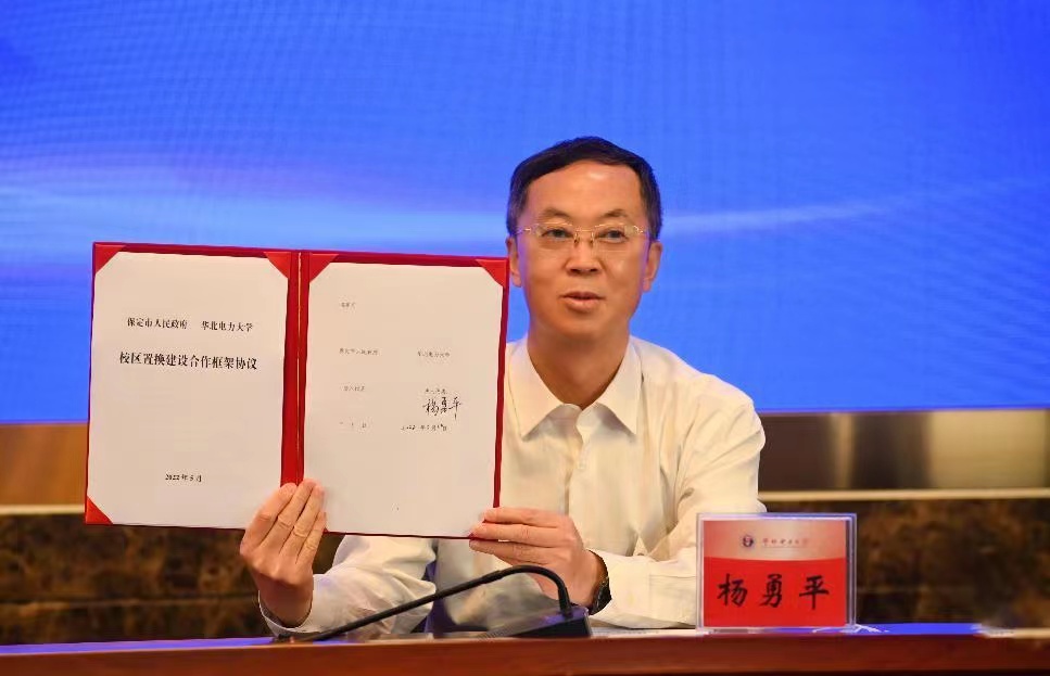 杨勇平和张贵宝代表双方签署《保定市人民政府与华北电力大学校区置换建设合作框架协议》。