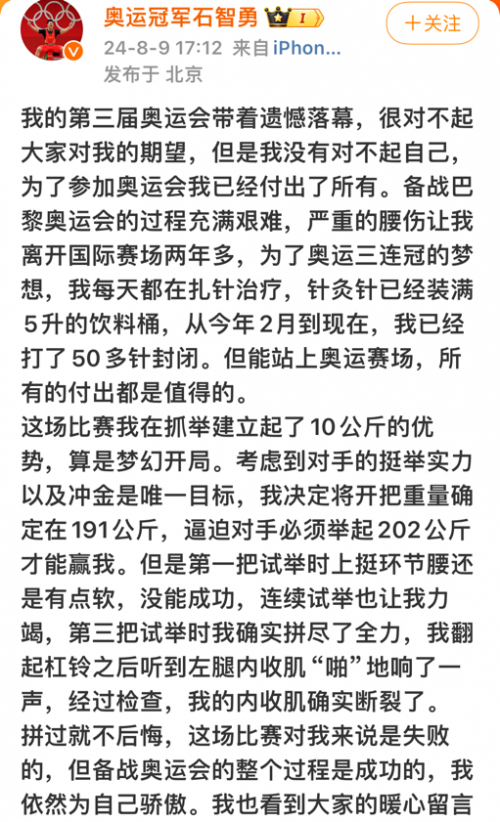 反观今年的巴黎奥运会,同样有让人惋惜担忧的运动员,举重队“三朝元老”石智勇在决赛中肌肉断裂,憾失金牌,令人扼腕。赛后在接受央视采访时,石智勇眼中湿润向大家道歉。