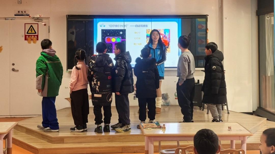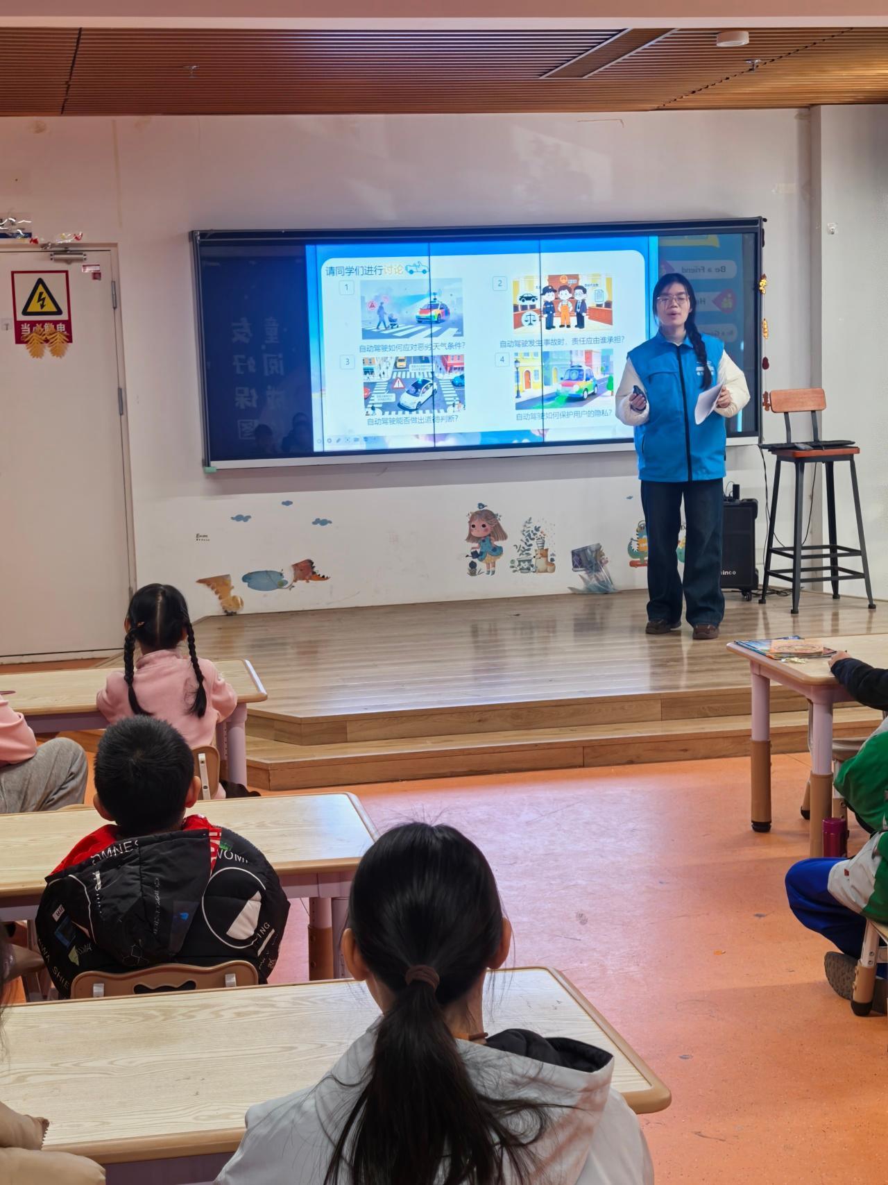 活动一开始,团队成员用一个充满童趣的问题点燃了孩子们的好奇心:“如果汽车没有司机,它怎么知道自己该往哪儿开?会不会撞到树?”孩子们纷纷举手,有的说“靠遥控”,有的猜“里面有小机器人”。在热烈的讨论中,团队成员顺势引出自动驾驶的三大核心系统——感知、决策与执行,并形象地将其比作人类驾驶时的“眼睛”“大脑”和“手脚”。为了加深理解,团队成员设计了一个“小小AI工程师”互动问答: