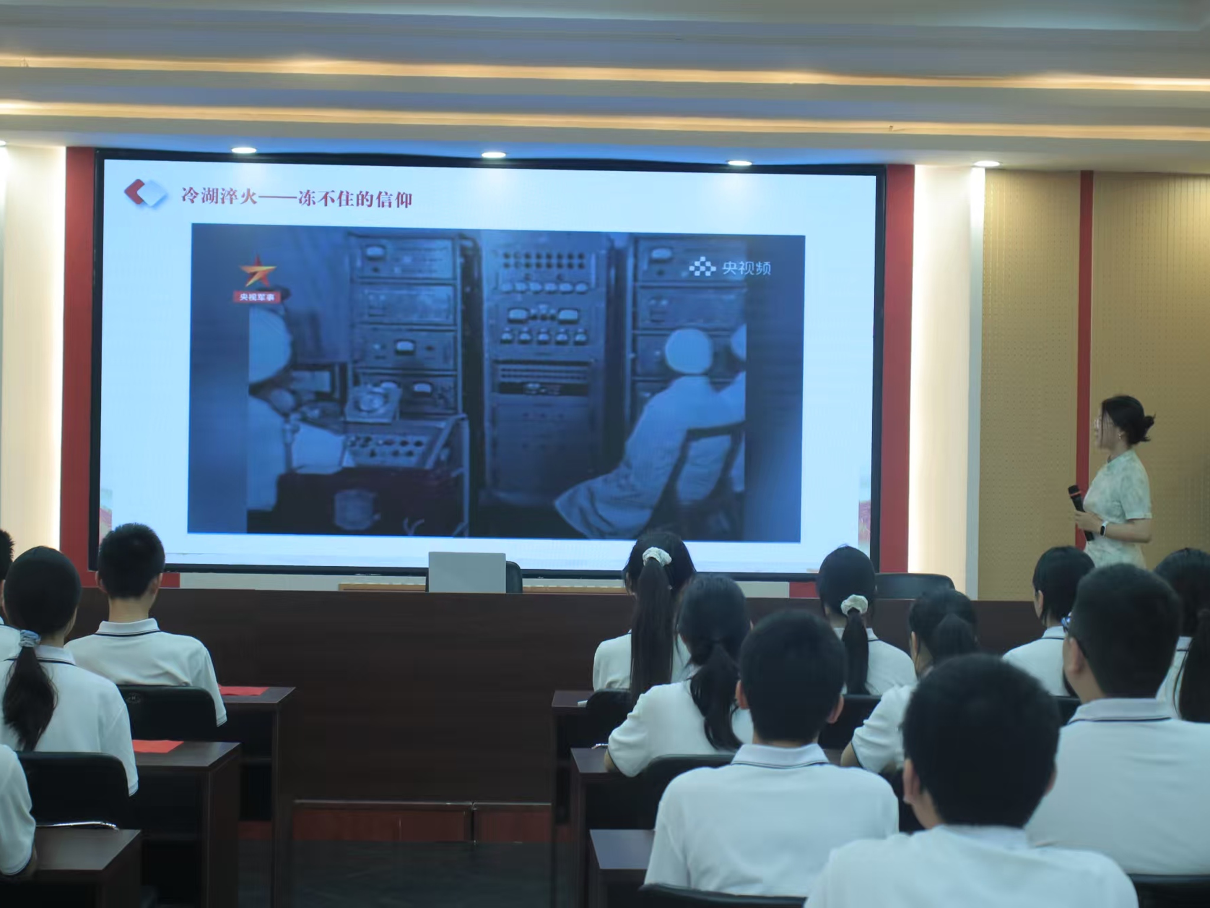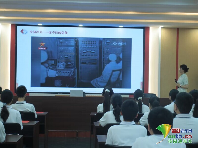 讲解员与同学们一同观看我国第一颗原子弹爆炸时刻纪录片。