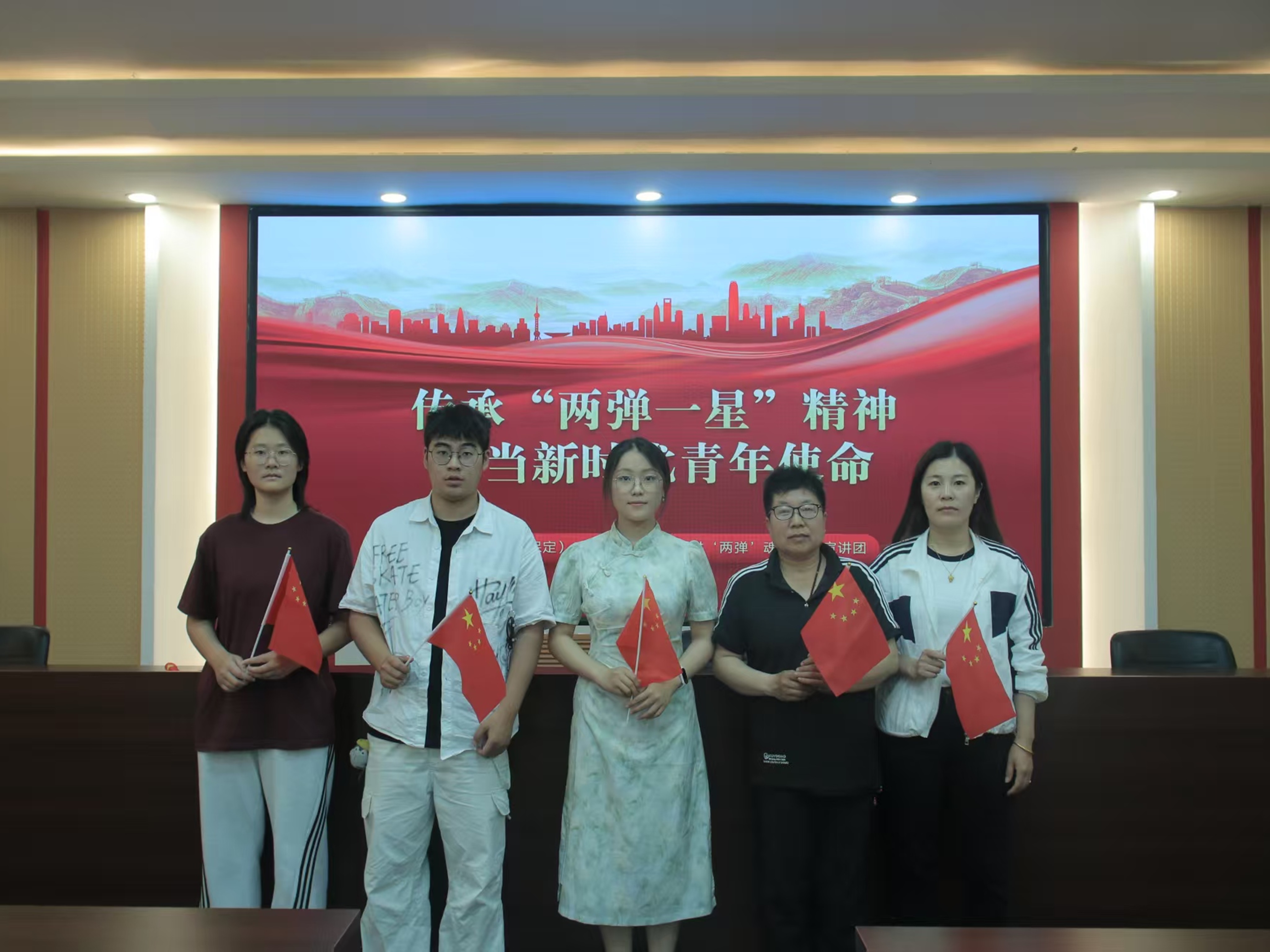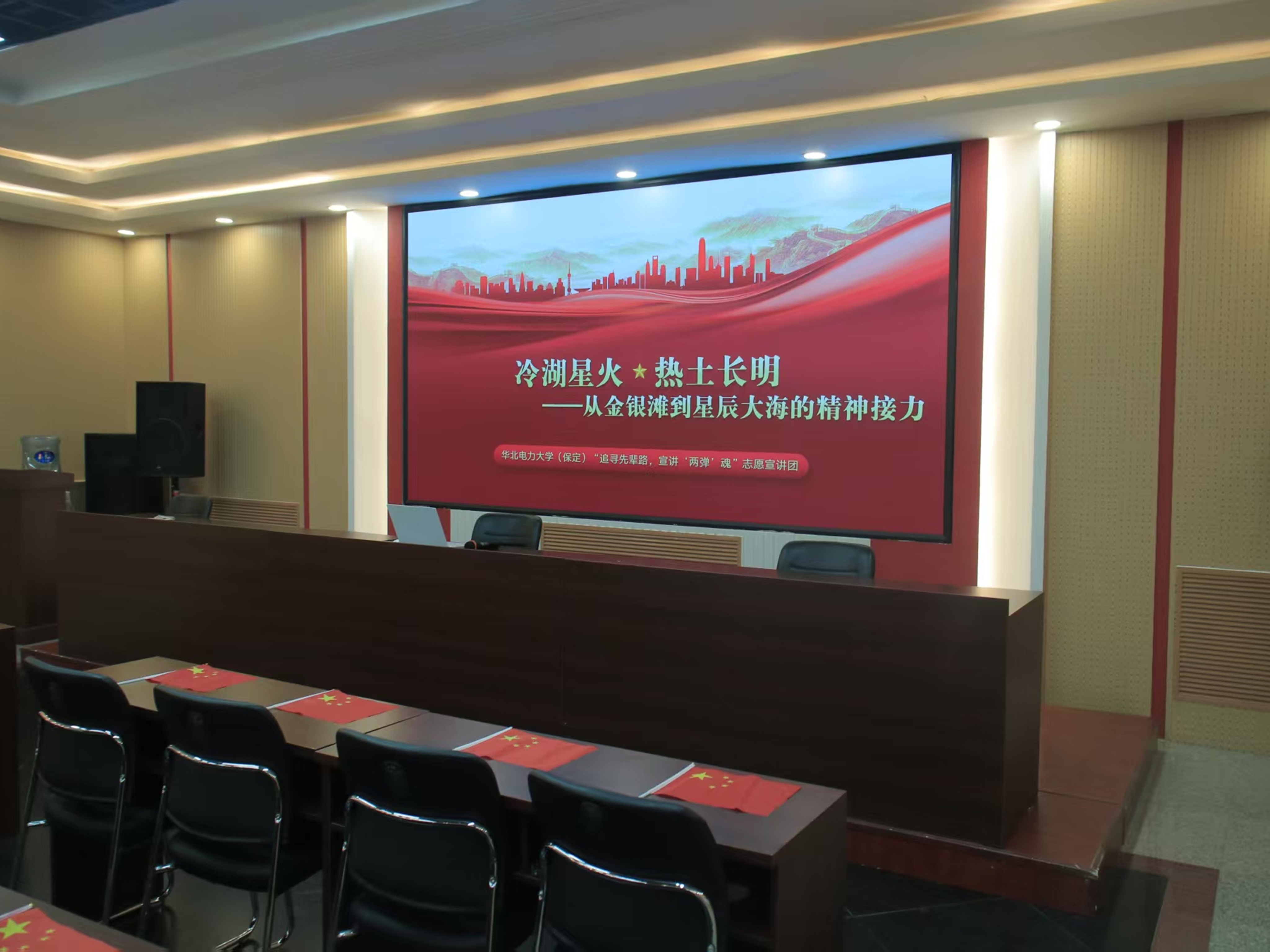 实践队员提前来到活动室准备PPT并分发小国旗。