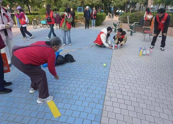 活动伊始,青年志愿者们来到社区中心文化广场,耐心地为老人们讲解保龄球规则。随后,青年志愿者们用塑料瓶充当保龄球瓶,用网球作为保龄球,与老人一起进行“保龄球”游戏。