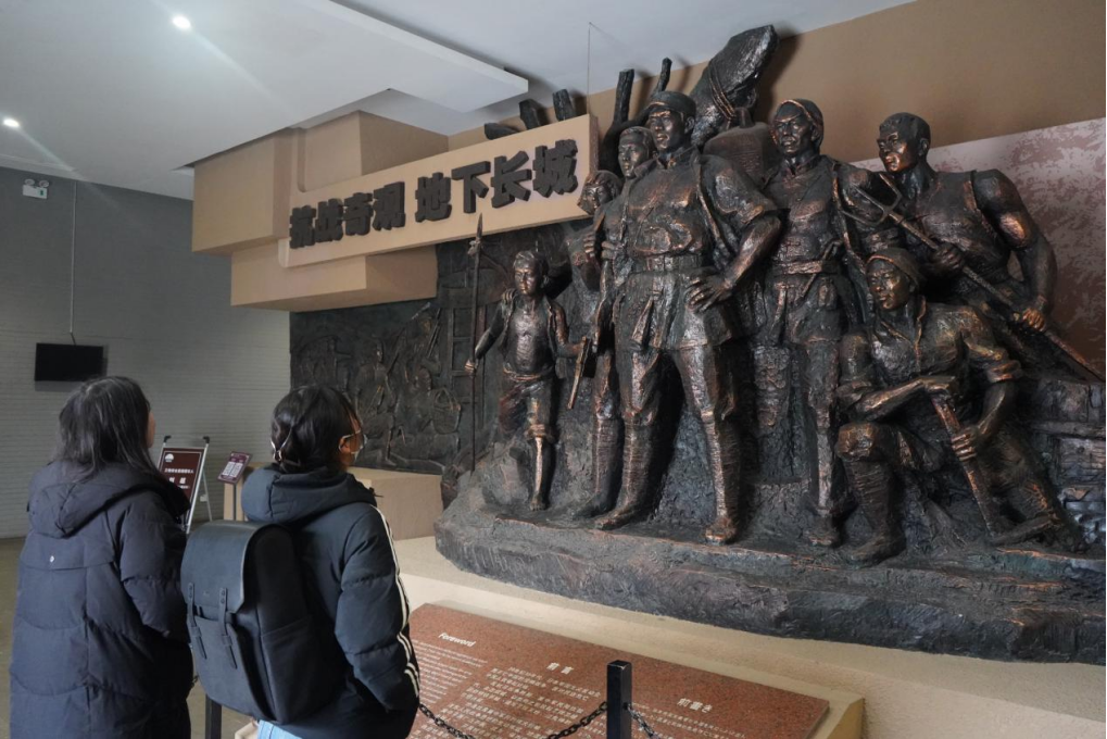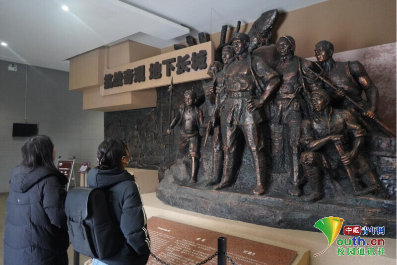 图为法政系“红色筑梦”实践队员在冉庄地道战遗址瞻仰馆内雕塑,了解了学习冀中平原地道的形成。中国青年网通讯员 王乐乐 供图