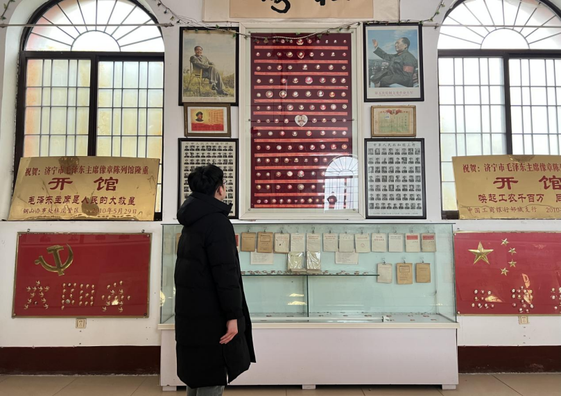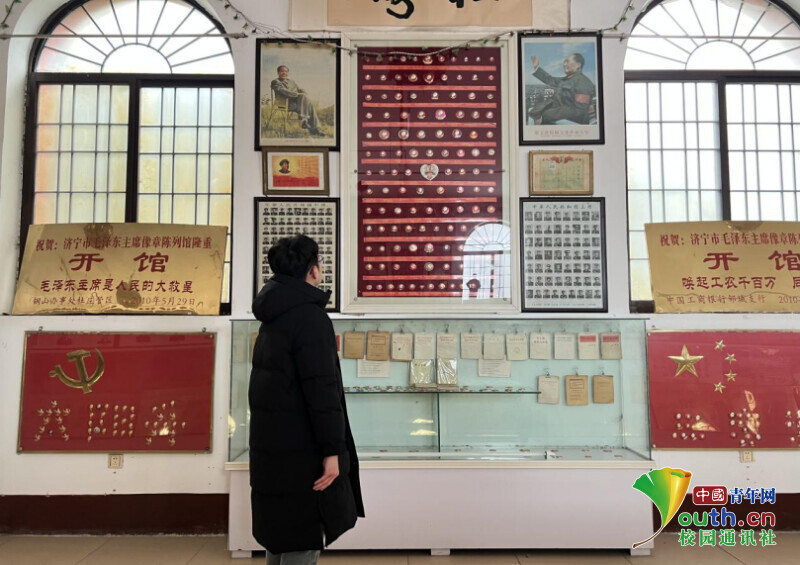 图为自动化系“赓续红色血脉,感悟奋斗成就”实践队员参观毛主席像章。中国青年网通讯员 王乐乐 供图