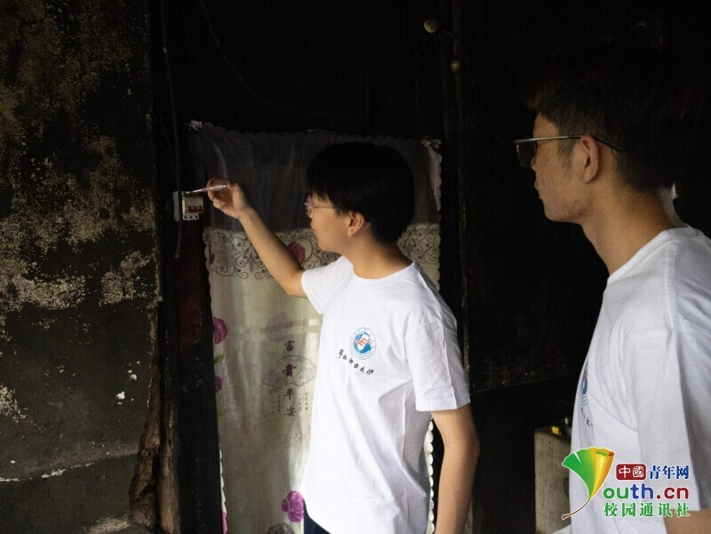 图为实践队员在电工师傅指导下提出用电安全隐患,并为村民制定相应整改措施。