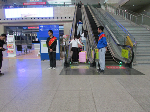 根据工作人员的安排,在每个检票口、电梯口和大门入口设置有两名志愿者协助管理秩序,防止有推挤事故发生;在总服务台设置两名志愿者帮助旅客找到相应的检票口。