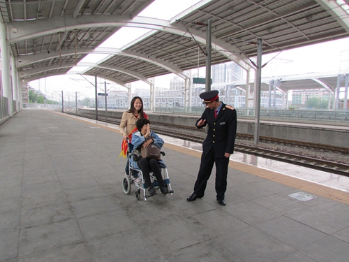 本想就这样静静的服务一上午就可以体验到火车站的服务过程,突发的一件事让志愿者们看到不一样的火车站服务。在保定下车的一位旅客在旅程中崴了脚,无法从站台出站,于是工作人员让志愿者推着轮椅去接旅客,并送旅客到指定地点等待旅客的家人。从整个过程中,旅客的感激、工作人员的热情都让志愿者们感受到火车站服务的快乐。