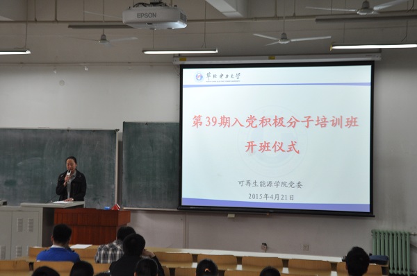 4月21日中午,可再生能源学院举行了第39期入党积极分子培训班开班仪式,学院党委书记刘永前、党委副书记张利出席了开班仪式。此次仪式由14级辅导员李鹏主持,可再生能源学院入党积极分子120人参加了本次党课。