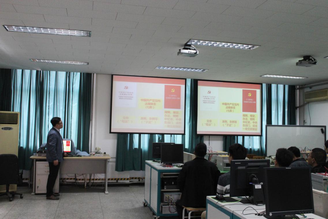 首先,戴志辉带领全体师生党员学习党章历次修订的历史。中国共产党自1921年诞生至十九大先后制定、修正过十九次党章。在按照时间线顺序逐一介绍完之后,戴志辉指出,党章是党的总章程,是党的根本大法,是全党必须遵循的总规矩;要学习党章,要尊崇党章,要执行党章,这是党员的应尽义务和庄严责任,只有这样做,才能把党建设得更好。
