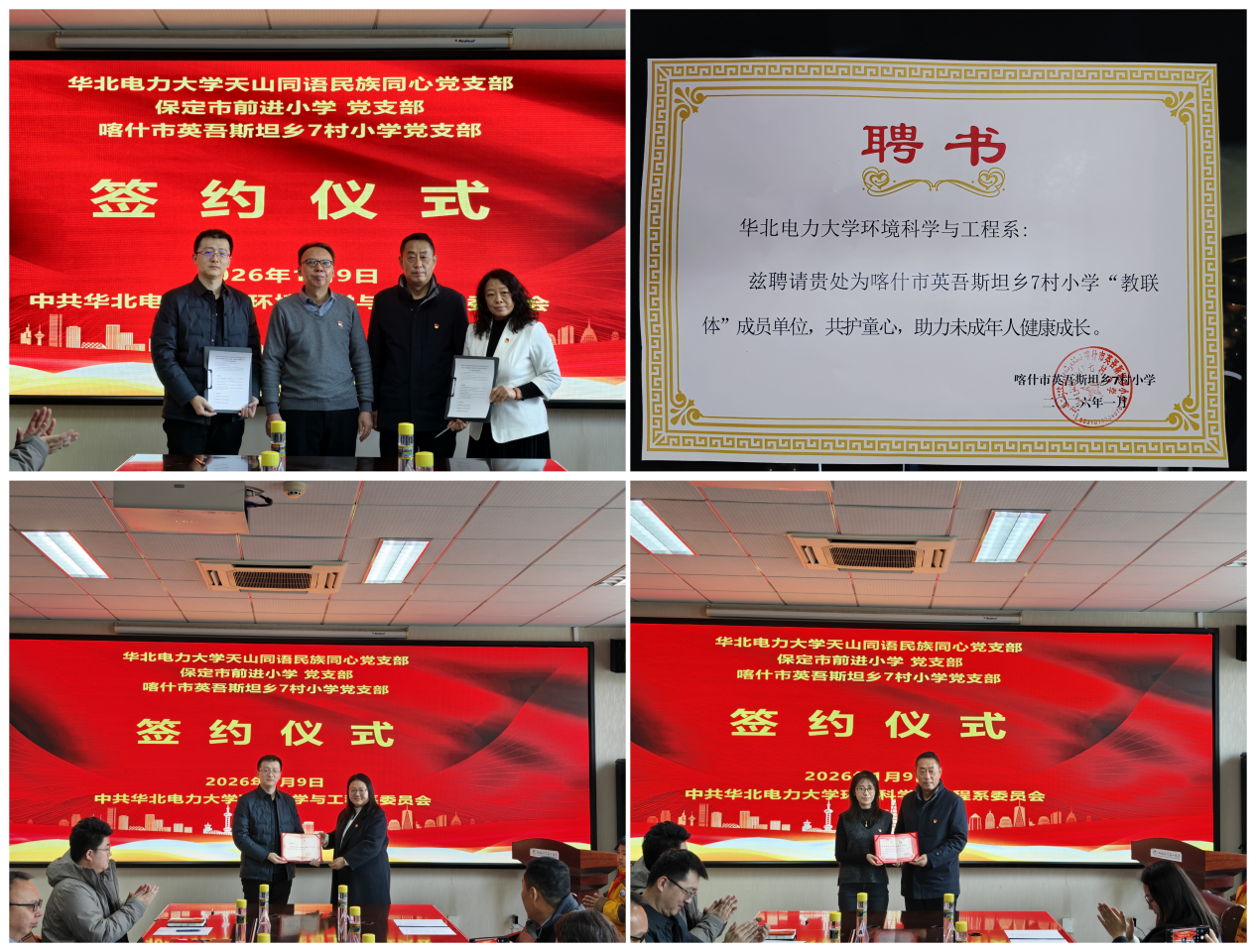 本网保定讯:为深入贯彻落实党的二十大关于铸牢中华民族共同体意识的战略部署,深化党建引领思政教育一体化建设,2026年1月9日上午,环境科学与工程系党委在实验综合楼A205会议室举行大学小学思政教育一体化支部联学共建签约仪式。华北电力大学天山同语民族同心党支部与保定市前进小学党支部、喀什市英吾斯坦乡7村小学党支部签署共建协议。保定市前进小学党支部书记、校长马福平,党支部副书记李颖,副校长杨立华,科研副主任刘天姣,教导处副主任刘娜,喀什市英吾斯坦乡7村小学党支部书记杨保强,校长、党支部副书记克热木·伊米提,环境科学与工程系党委书记付东、天山同语民族同心党支部书记王成等出席仪式,20余名师生代表共同见证。