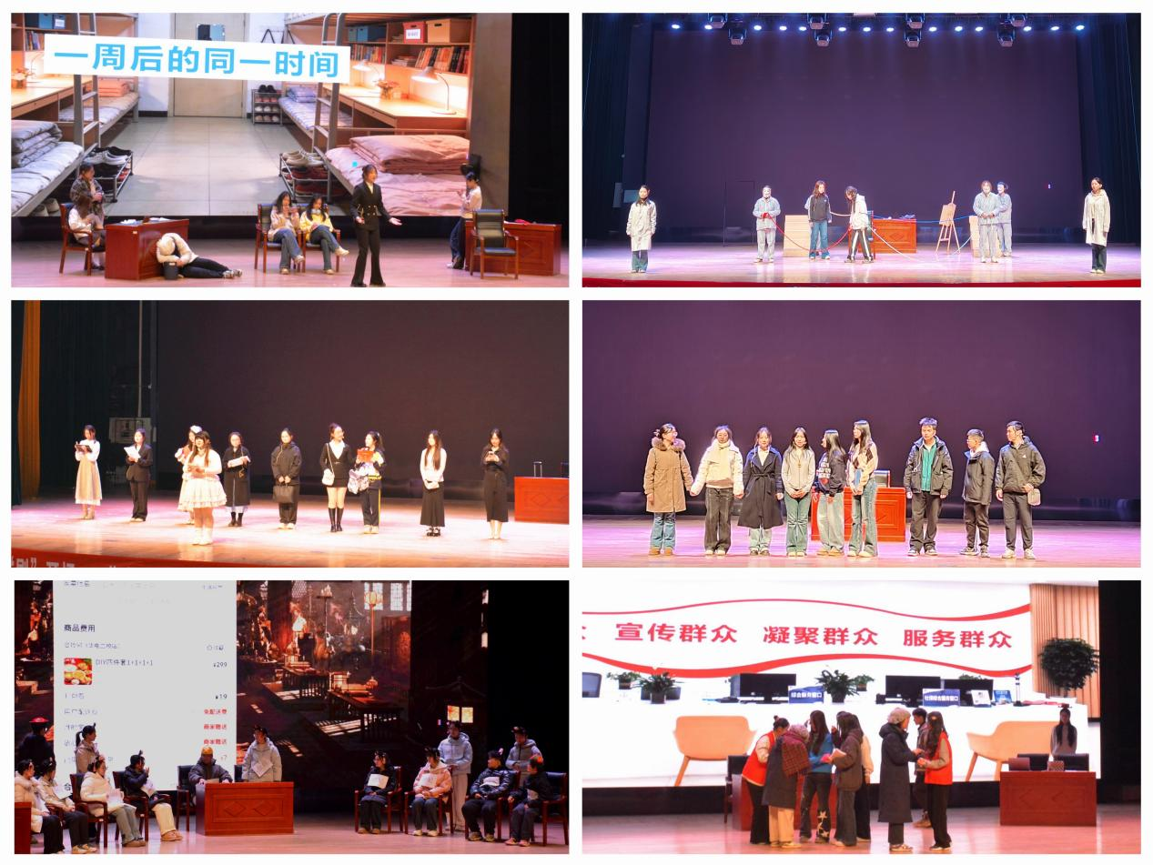 展演在改编话剧《谁杀死了周日》中拉开序幕,该剧由法学2502班带来,以轻松幽默的方式揭示拖延心理,引发在场学生的共鸣;法学2501班演绎的《镜中人偶》运用强烈的肢体语言,刻画青年在压力中寻求自我突破的历程;行管2502班呈现的《红楼又梦》以当代视角重新诠释经典,赋予红楼女性崭新的生命轨迹;行管2501班带来的《琥珀之光》聚焦学业诚信与成长阵痛,展现少年在错误中的觉醒;社工2502班创作的《甄嬛传之外卖风波》巧妙融合古装情节与校园日常,诙谐生动,气氛热烈;社工2501班演出的《代码之外,人心之内》基于社会工作的专业视角进行演绎,引发对技术依赖与人文价值的深刻思考。