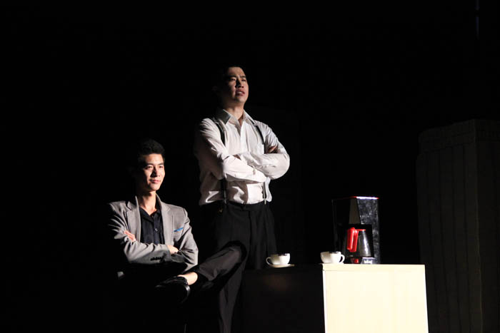话剧的第一幕——“求证”,聚光灯刚亮,便听得两个高谈论阔的声音,原来是银行经理Tom(王昊饰)和一个客户样的人Sunny(邵帅饰)正在客套着谈论生意场上的一些事,然而当Tom问及Sunny要办理什么业务时,剧情陡然发生转折,只见Sunny与同伙Ben(刘聪饰)掏出明晃晃的手枪,高呼:“打劫!”至此,“打劫”好戏拉开了帷幕。