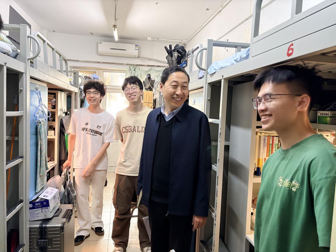 张德安在走访部分本科生宿舍的过程中,与各年级同学亲切交谈,了解了同学们在学业发展、住宿条件、人际交往及日常管理等方面的情况,叮嘱大家要合理安排作息,注重身心健康,共同营造积极向上的宿舍氛围。他同时结合学校教育教学思想大讨论工作部署,鼓励同学们围绕学院专业建设、培养方案、评价体系等多方面积极建言献策。