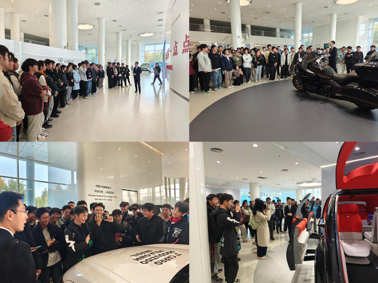 师生一行分别到实验室、汽车展厅进行参观。在电磁兼容实验室,通过科研人员的细致讲解,同学们不仅直观了解了车辆应对复杂电磁环境的奥秘,更深刻感受到专业基础知识在工程实践应用中的价值。在环境风洞试验室,车辆在多种温度、湿度、风速、光照强度的模拟试验环境下接受测试,同学们切身感受到了“看不见的科技”对汽车品质与安全所起到的决定性作用。在汽车展厅,从核心的实物部件解剖,到完整的实车展示,再到企业品牌发展理念墙让同学们系统地了解了长城汽车的关键技术、整车制造和品牌战略布局。这场沉浸式的教育活动,将书本理论知识在产业实践中的应用生动展现在同学们面前,激发了同学们的学习热情与专业认同感。