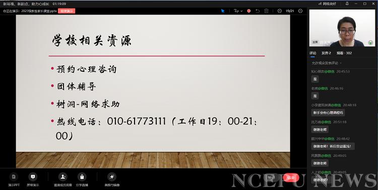 考虑到报到当天部分新生家长因为行程安排未能参加第一场,心理健康教育中心还安排了第二场线上的家长课堂。9月5日晚,第二场家长课堂如期举行,由心理健康教育中心资深专职教师许玉萍主讲。许玉萍首先从新生入学后常见的心理困扰谈起,并对引发心理困扰的原因进行了深入剖析。她指出,大学阶段主要的心理发展任务是自我认同,自我认同发展得好,学生会对自我有客观、清晰、稳定的认识,有明确的自我价值感,也会有较为清晰的发展目标。作为家长,面对孩子的成长过程,需要给予孩子时间空间、尊重孩子的选择、鼓励孩子面对困难,学会理解、尊重、接纳孩子,才会真正助力孩子健康成长。讲座最后,许玉萍提示每位家长要学习关爱自己,推己及人。整个讲座过程,许玉萍以理论讲授、案例分析、互动讨论等方式与家长们进行了一个半小时的沟通与分享。讲座结束后,家长们纷纷留言,表示受益匪浅。