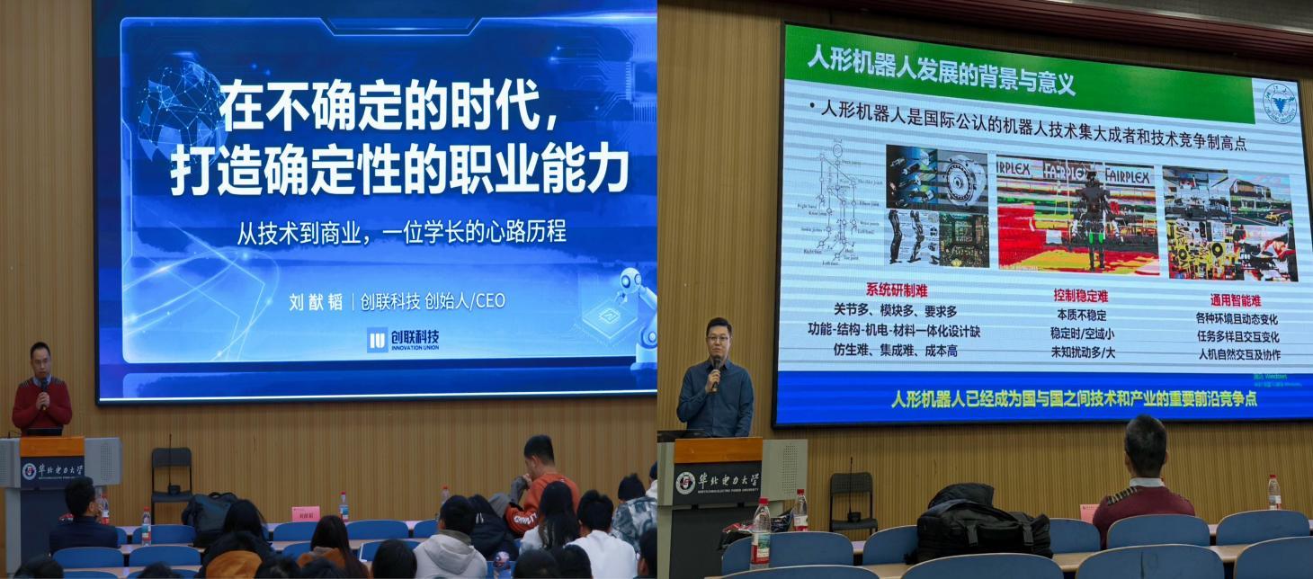 龚国敏和刘猷韬进行学术交流。龚国敏以“具身智能人形/四足机器人应用场景探索与实践”为题,分享了云深处在人形机器人和四足机器人方面的研究进展,包括基于强化学习的运动控制、视觉语言导航、复杂环境智能感知等前沿技术。刘猷韬以“在不确定时代打造确定性的职业能力”为题分享了对技术、商业与产业价值的思考,他强调在技术浪潮快速迭代的今天,真正的确定性来源于对核心技术的深耕,以及为客户创造不可替代价值的坚持。