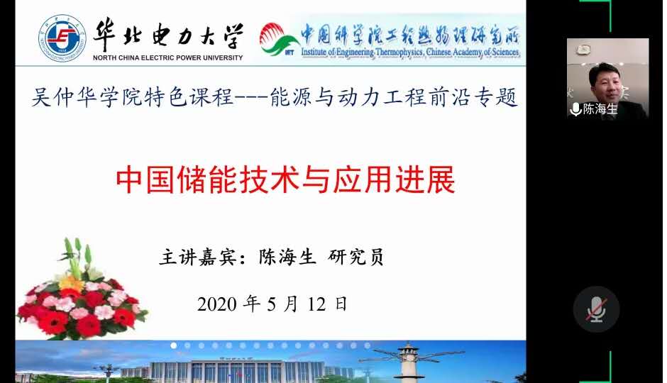 应动力工程系和吴仲华学院邀请,5月12日,中国工程热物理学会副理事长兼秘书长、中国能源研究会储能专委会主任、中国科学院工程热物理研究所博士生导师陈海生研究员为我校北京校部和保定校区全体吴仲华学院17级本科生在线讲授《能源与动力工程前沿专题》第一讲《中国储能技术与应用进展》。报告由动力工程系副主任张磊教授主持,我校北京校部和保定校区教师、学生代表200余人参加会议。