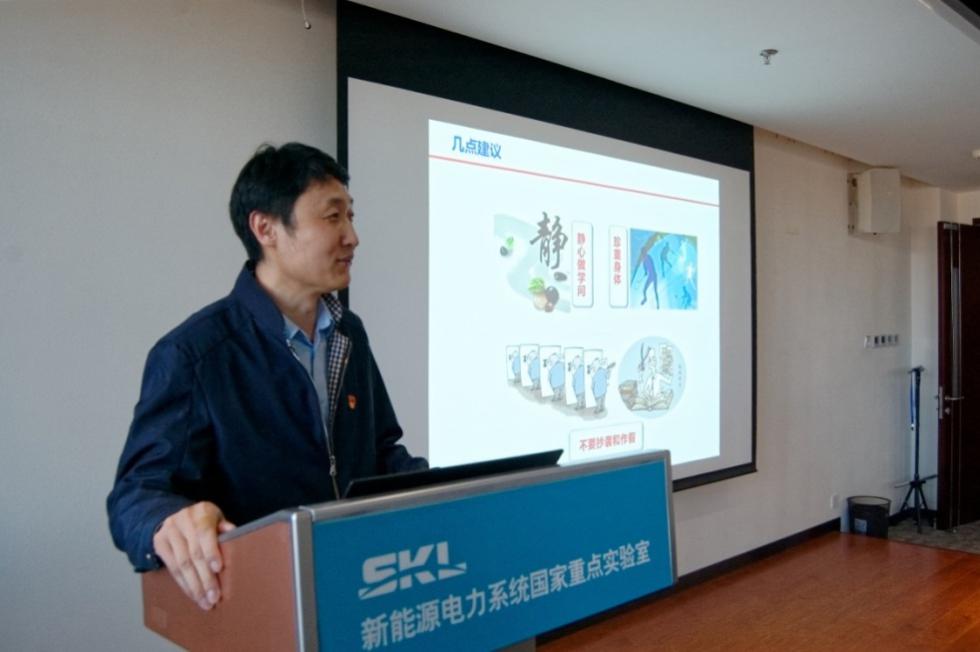 新能源电力系统国家重点实验室副主任彭跃辉老师为同学们播放了新能源电力系统国家重点实验室纪录片,展示了其发展历程及突出成果。随后,以“团结 勤奋 求实 创新”为题,介绍了国家重点实验室在国家科技创新体系中的地位和作用、回顾了申报和建设国家重点实验室的艰辛历程和个人体会,并对全体博士生提出了“遵守学术规范、精心学习研究、珍惜身心健康”三点建议。