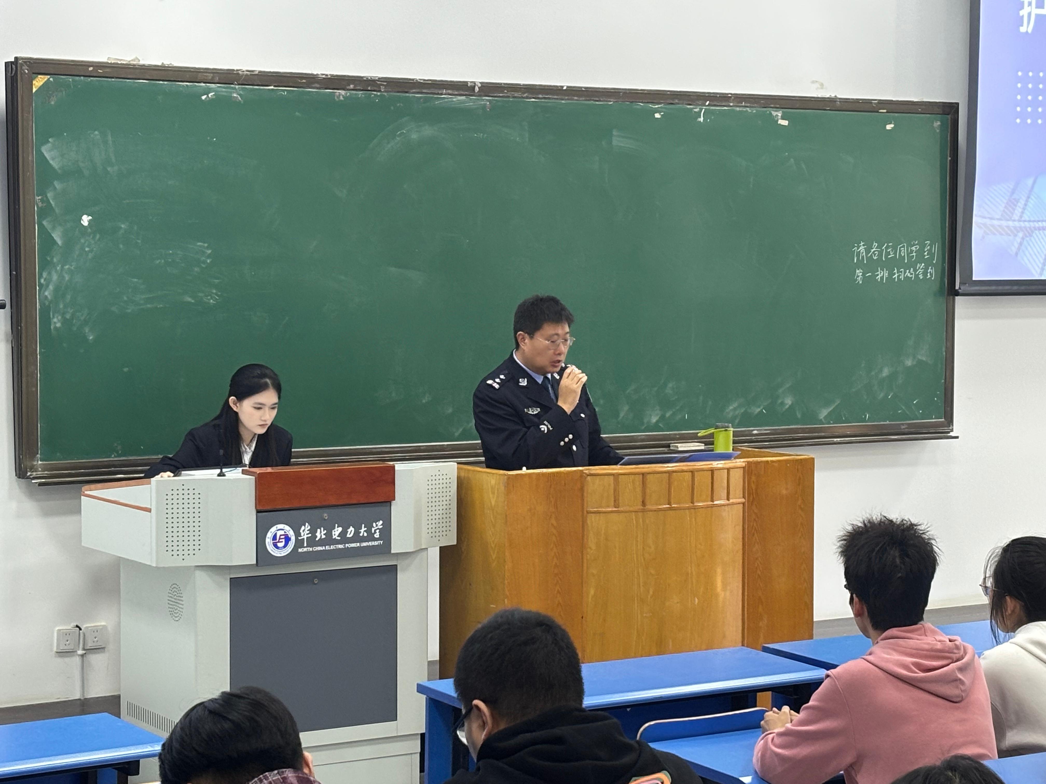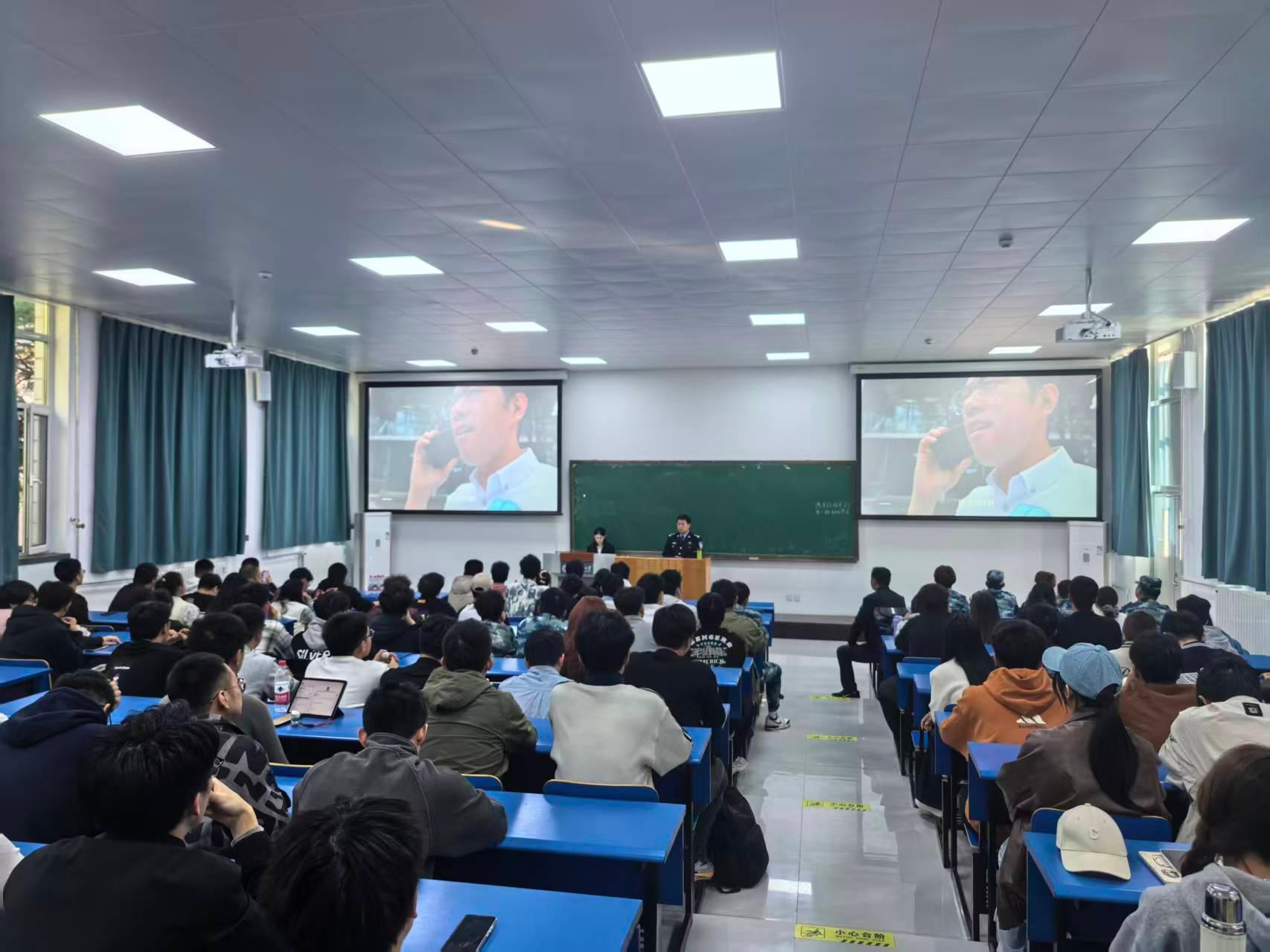本网保定讯:为切实提升广大新生的反诈意识和识骗防骗能力,引导学生树立正确的反诈观念,有效遏制校园电信网络诈骗案件的发生,2025年10月14日,保卫处(保定)特邀保定市公安局竞秀分局理论特派员、社会主义核心价值观普法宣传员樊鹏警官,在瑞祥院区开展“筑牢防诈防火墙,护航科研人生路”反诈骗专题知识讲座。