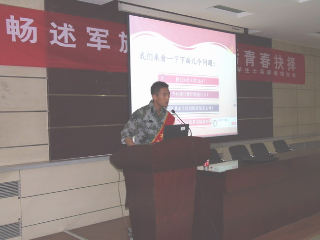 报告会开始,安辉提到,军人,是这世界上最伟大的事业。在军营中体验生活,让人生经历更加丰富;在摸爬滚打中锻炼自己,使自身发展得到全方位提高。随后就“为什么要当兵”“当兵能让我们收获什么”两方面内容,讲述自身军旅生涯的同时与报名入伍的同学进行沟通交流、传授经验,并且指出就大学生而言,当兵是一个普通公民应尽的光荣义务,对个人而言,当兵更是最有意义的人生磨练机会,是年轻人走向成熟的最佳人生平台,是经受艰苦生活磨练的绝好机会。现今大学生参军入伍有了制度保障,也有了更多优惠政策,也为了广大学生的个人发展提供了新的舞台。