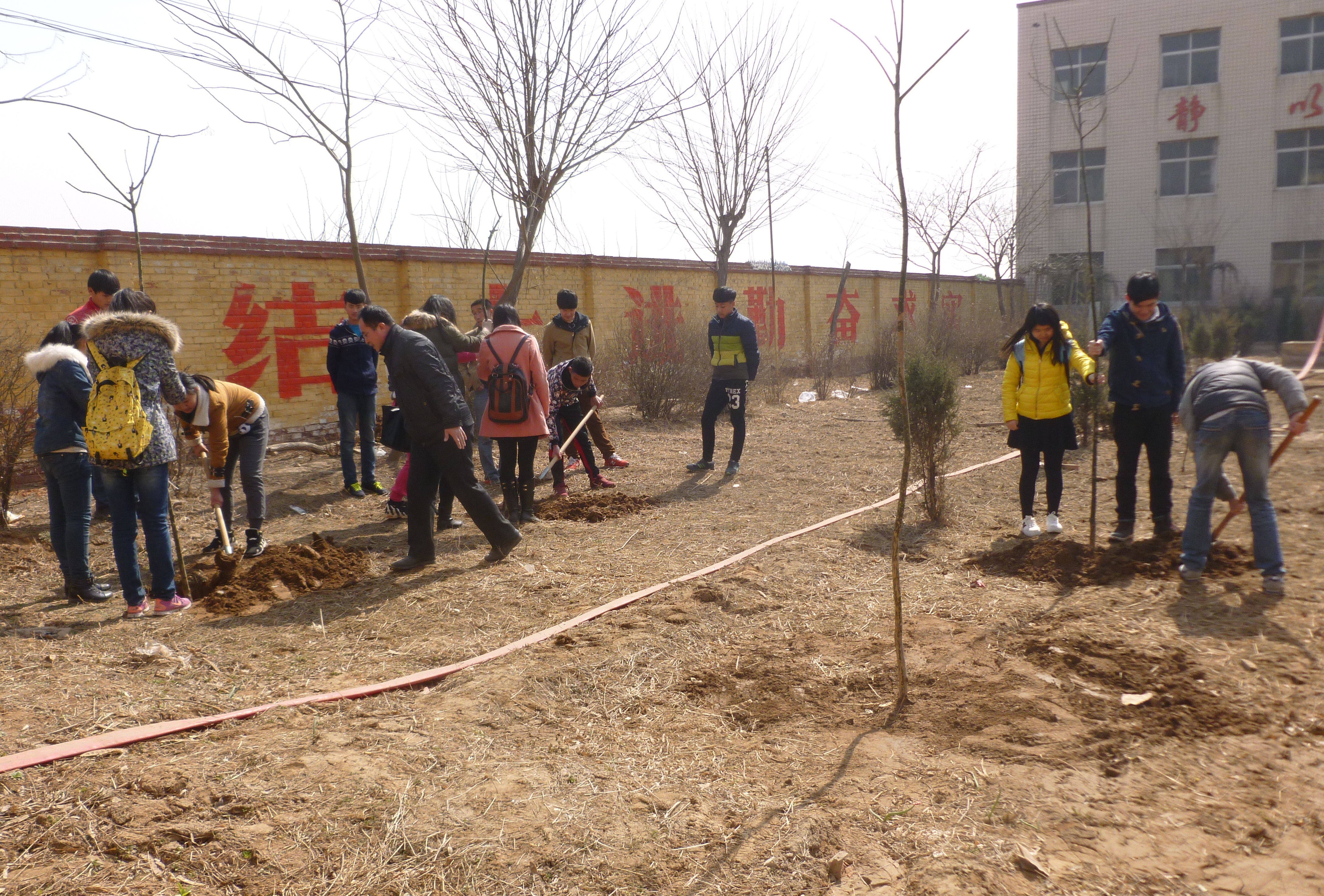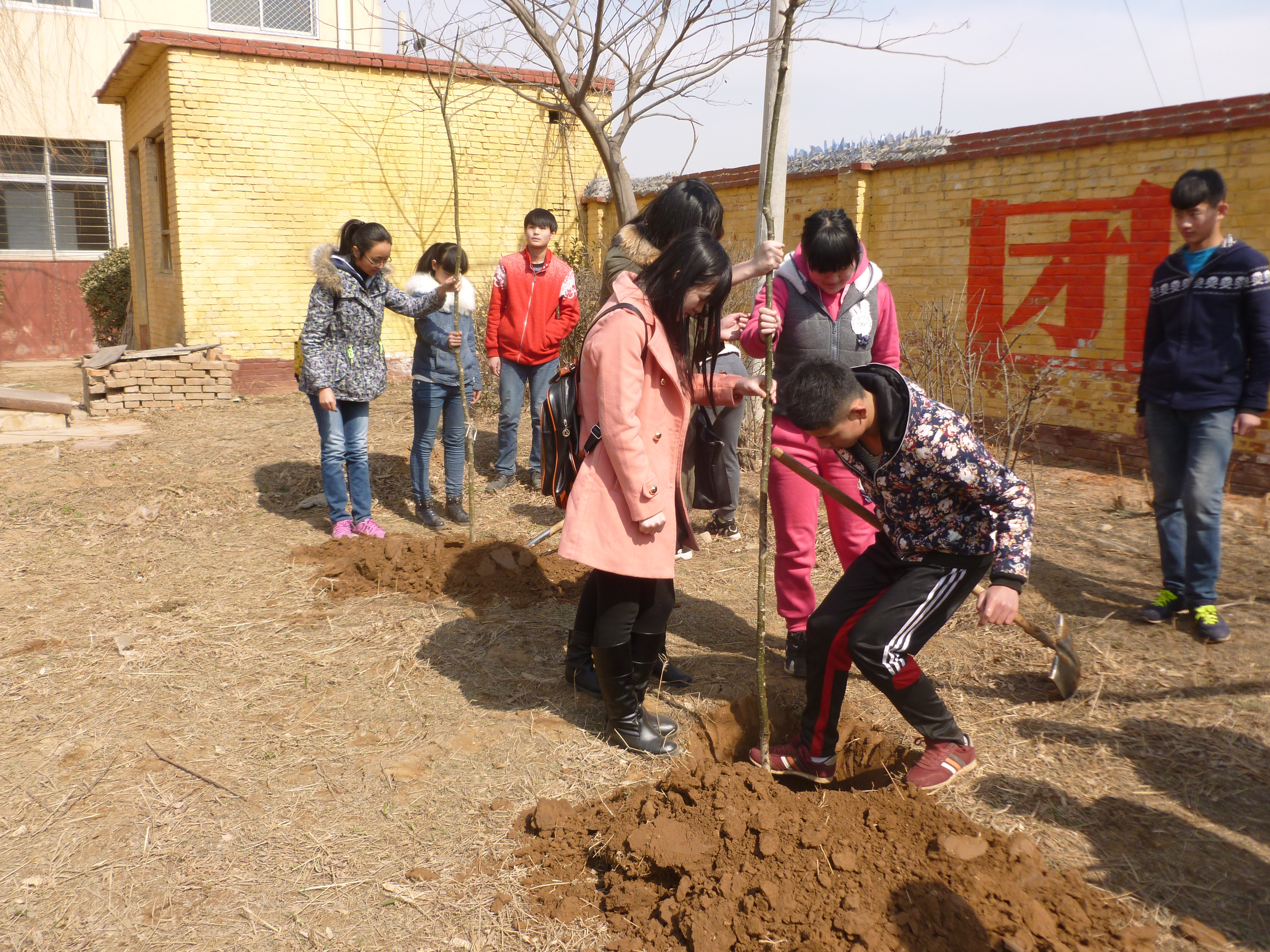志愿者与孩子们分三组进行植树。虽然大家都满怀信心、干劲十足,但由于缺乏实际操作经验,手执铁锹、镐头等工具的志愿者们显得有些笨拙。在谭校长和郭主任的指导下,大家通过观察和学习,重新合理分工,先由男生挖坑,再由女生和孩子们将树苗放入坑中,并让树苗与地面保持垂直,此时由大家一起填土并踩实。掌握了相对科学的植树方法,原本光秃秃的土地上不一会儿就栽满了小树,变得生机盎然。