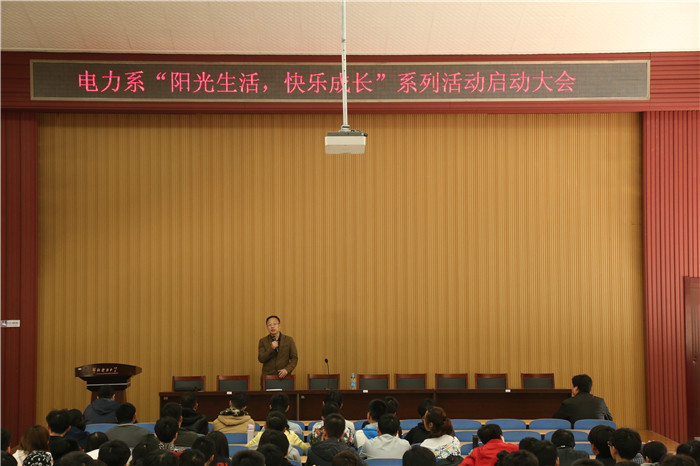 本网保定讯:4月11日中午,电力系在教六楼一阶梯召开了“阳光生活,快乐成长”系列主题教育活动启动大会,电力系党委副书记、各年级辅导员、各学生社团主要负责人、各班级班长、团支书、体育委员、心理健康委员参加了启动大会。电力系党委副书记彭忠军详细介绍了活动方案,系列主题教育活动核心内容为“开好两个会,搭建一个平台,搞好一个建设”,即每学期每个年级召开一次主题教育大会,每个班级召开一次主题班会,统一思想,引领方向;搭建适合普通学生广泛参与的社团活动平台;搞好宿舍文明建设。