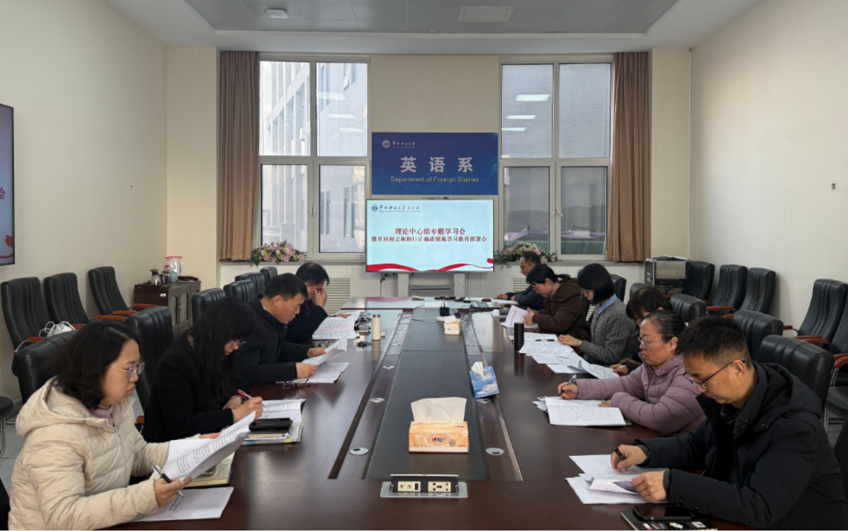 本网保定讯:为深入贯彻落实学校关于开展树立和践行正确政绩观学习教育的重要部署,3月9日,英语系在教十一D106召开理论学习中心组专题学习扩大会议暨树立和践行正确政绩观学习教育部署会。英语系领导班子成员、党委委员、基层党支部书记、两办党员教师参加了会议,会议由系党委书记武彦军主持。