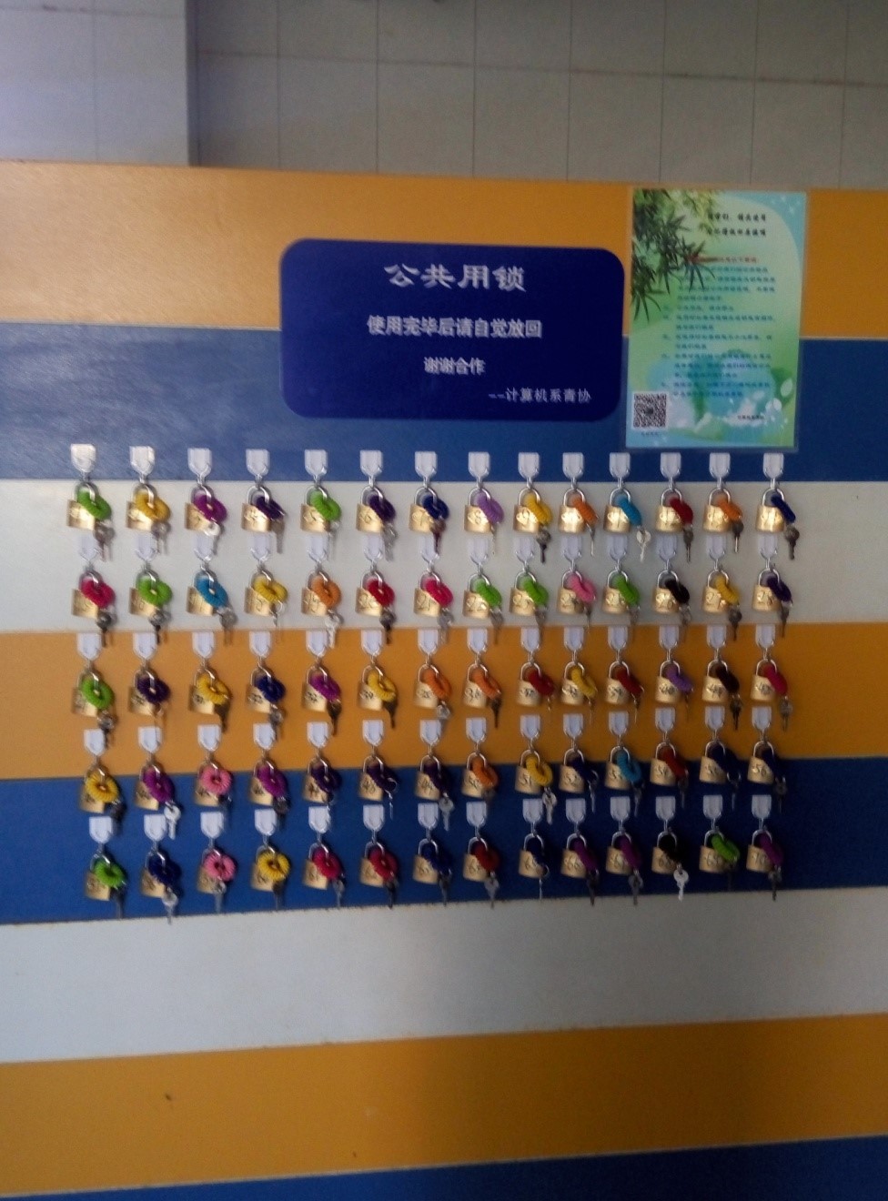至此,计算机系青协共投入了200把公共用锁以供同学们的使用。在公共用锁的基本保障下,同学们丢失财物的机率在降低,同时,也让同学们对个人财物的保护有了更深层次的认识。一把小小的锁,为同学们抹去了忧烦,带来了些许安全。