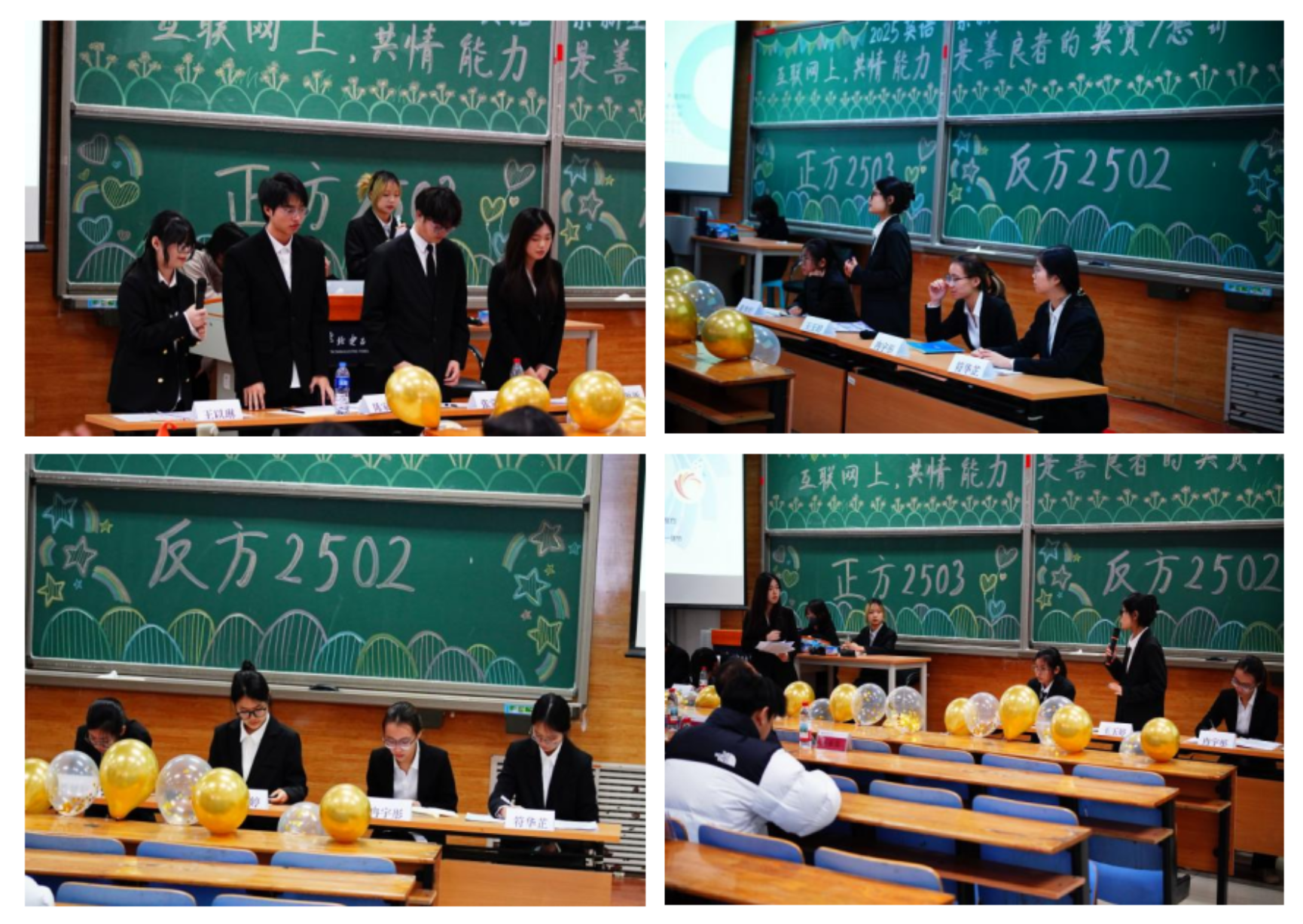 本次辩论赛以“互联网上,共情能力是善良者的奖赏还是惩罚”为核心辩题,设置立论陈词、对辩盘问、观众提问答疑等多个环节。比赛现场氛围热烈,正反双方辩手围绕辩题展开激烈交锋,思维的火花在唇枪舌剑中不断迸发。正方代表队立足共情的正向价值,从价值实现、自我成长、社群构建三个维度进行系统论证,鲜明主张互联网共情能够转化为实际帮扶行动、有效拓宽个体认知边界、凝聚社群向善力量,是对善良者的正向回馈与珍贵奖赏;反方代表队则聚焦互联网环境的复杂性与特殊性,以共情背后的潜在风险为切入点,从身心内耗、信任崩塌、道德绑架三个层面深入阐释,提出互联网共情易引发情绪透支、导致善意被滥用、滋生道德绑架乱象,实则是对善良者的无形惩罚。双方你来我往、攻防有序,围绕互联网共情的价值导向与潜在风险展开层层剖析,用精准的逻辑、流畅的表达呈现了一场精彩绝伦、扣人心弦的辩论盛宴。
