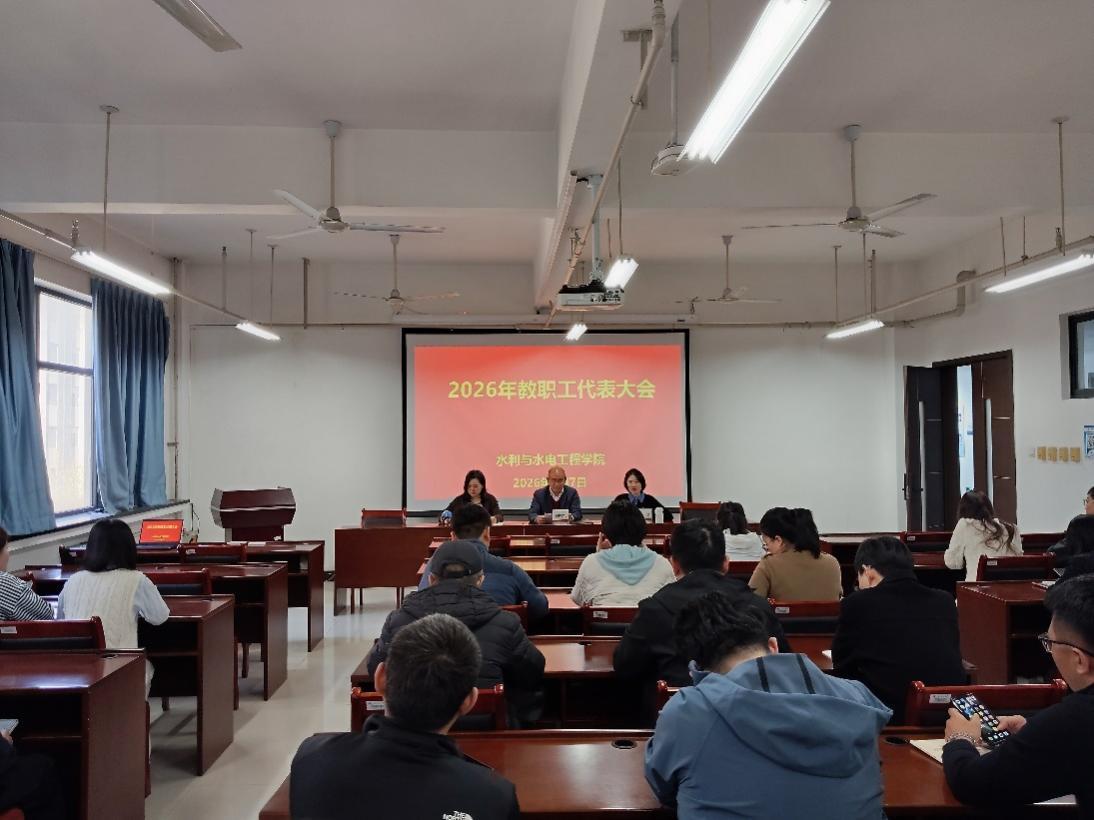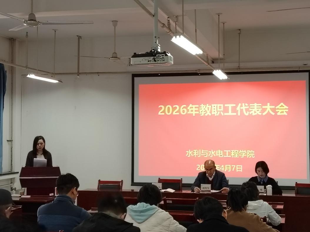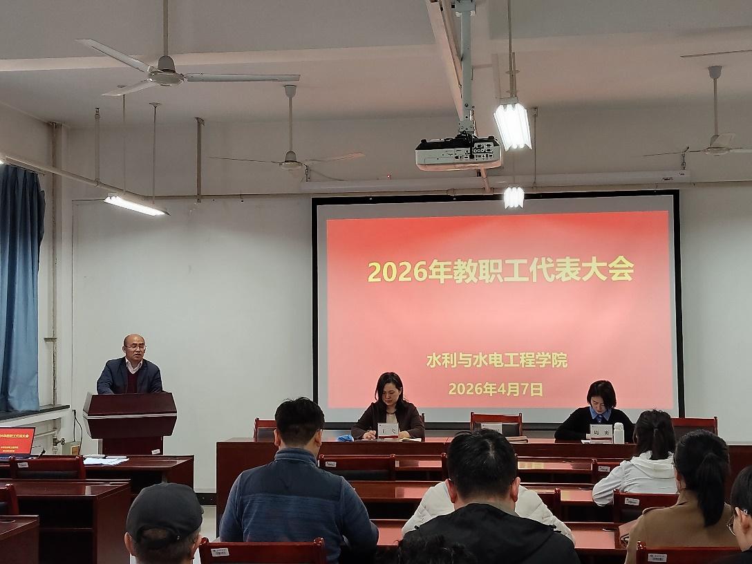4月7日下午,水利与水电工程学院召开了2026年教职工代表大会。全体院领导班子和教职工参加会议,会议由学院党委副书记、工会主席周爽主持。