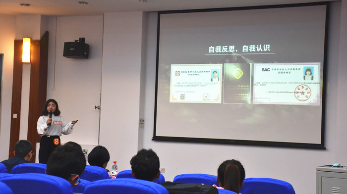 随后是6号选手计科1601班白雪薇的展示,她用清晰的语言、缜密的分析,呈现了成为商业银行首席技术运营官的梦想。7号选手是工程1601的田文博,她依托专业,想要成为外企或合资企业的工业工程师。最后是来自工商1501班的吴晴雯,她结合定量定性的分析,通过实地实习体验,展示了成为金融行业管理咨询经理的职业梦想。
