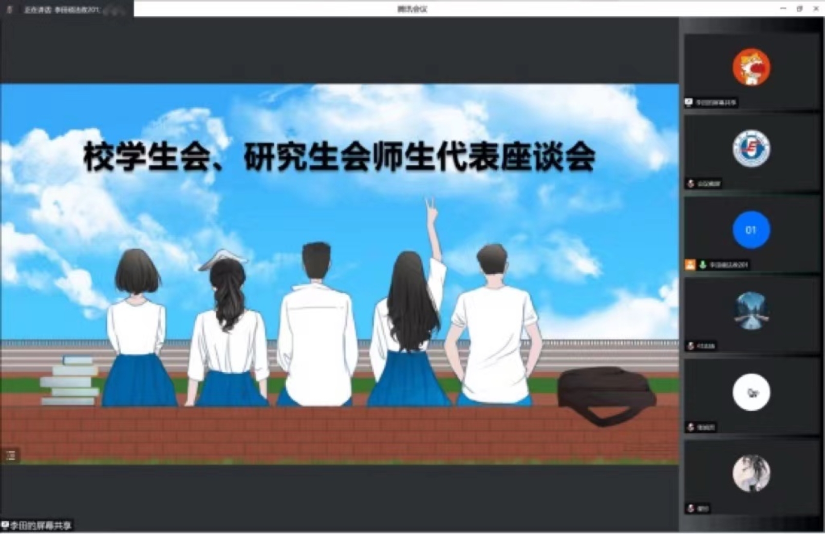 参会学生代表分别结合自己及身边同学的情况,围绕思想动态、学业发展、疫情防控、基层团组织建设、校园文化活动等方面进行交流发言。大家普遍集中关注习近平总书记在庆祝中国共青团成立100周年大会和在中国人民大学考察的重要讲话精神的学习,疫情防控常态化下校园管理和校园文化活动开展,个人的成长发展等方面,同学们对学习生活中集中关心的问题提出了意见建议。