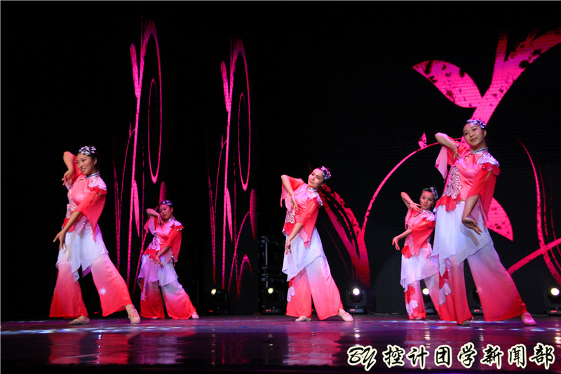 二胡、琵琶和大提琴的声音融合在礼堂上空,身着粉色舞裙的伊人们翩跹起舞,如同盛开的鲜花,红袖一袭香韵满,佳人娇娆舞清姿。阿丽努尔、张婧怡等同学的曼妙的舞姿与悠远绵长的乐声相互交缠,暗香袭人,令人沉醉。