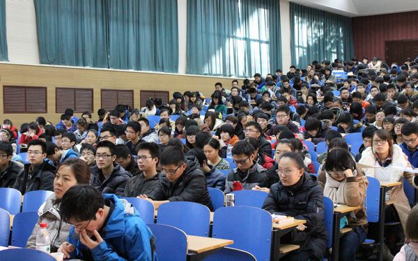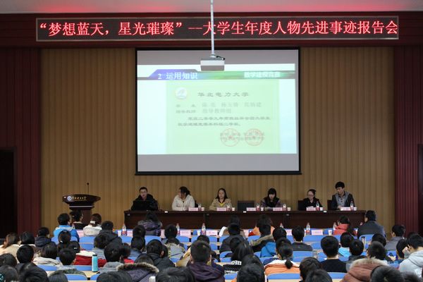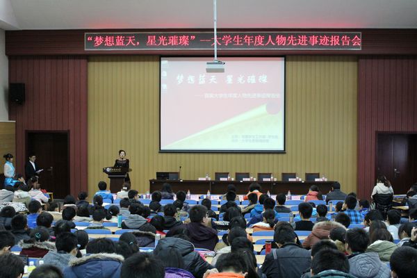 本网保定讯:为深入贯彻落实党的十八大精神,进一步挖掘、培育和宣传我校大学生中的先进典型,营造优良的学风,根据“我的中国梦”主题教育活动的整体安排,保定校区于11月28日下午,在教六一阶梯成功举办“梦想蓝天,星光璀璨”——大学生年度人物先进事迹报告会。学生处副处长李瑾,各院系2013级辅导员和500余名大一新生听取了报告会。