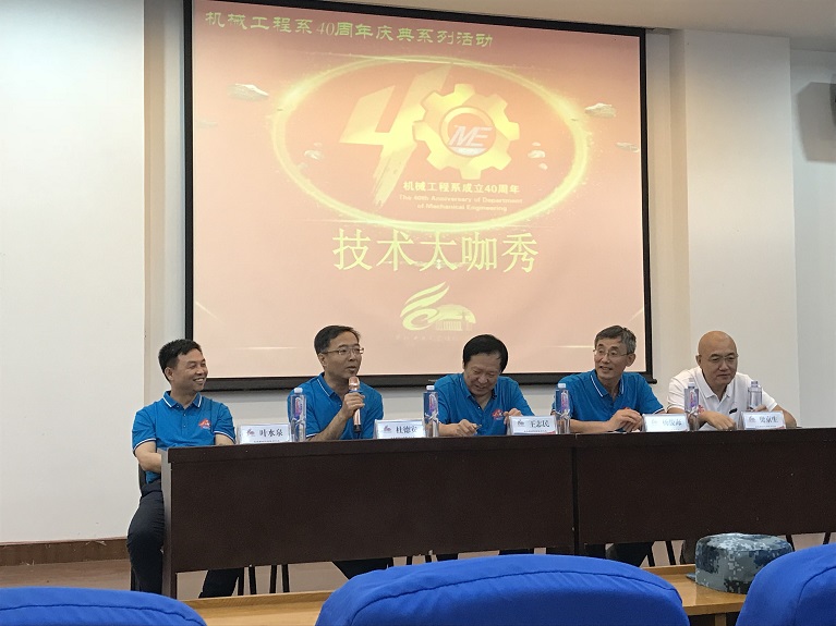 本网保定讯:9月22日上午,机械工程系成立四十周年庆典活动之“技术大咖秀”在教九楼报告厅举行。机械78级校友杨俊海、王志民,81级校友杜德安,82级校友叶水泉,84级校友樊京生等返校应邀作报告。王璋奇教授、郑海明教授以及在校生200余人参加此次活动。