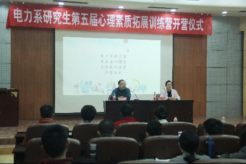 本网保定讯:11月17日上午,由电力系研究生会心理部主办的“第五届心理素质拓展训练营开营仪式”在图书馆地下报告厅举办。电力系党委副书记彭忠军,辅导员李慧,2017级全体电力系研究生以及2016级心理委员代表参加了此次开营仪式。本届心理素质拓展训练营开营仪式目的在于鼓励电力系研究生新同学关注心理健康,了解更多关于心理健康方面的知识。