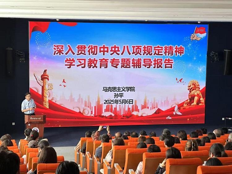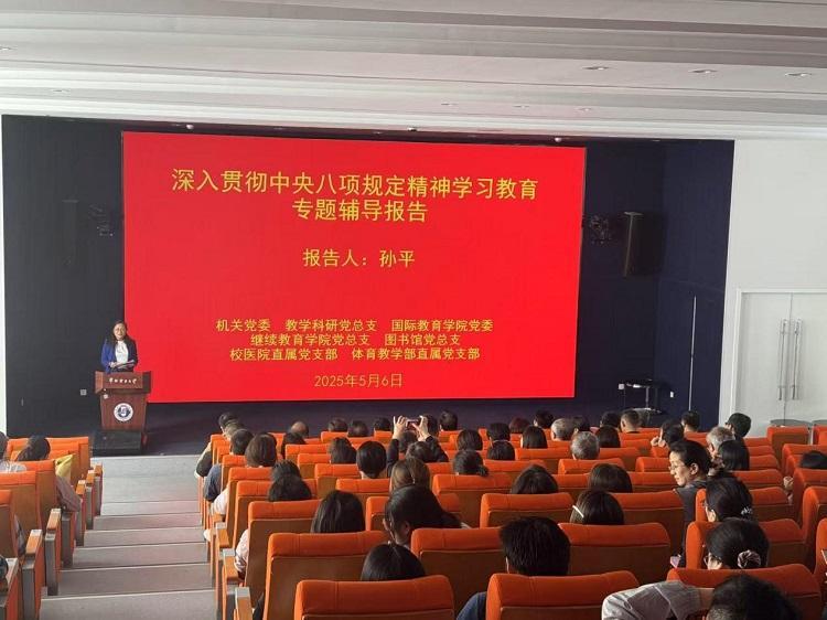 为深入贯彻中央八项规定精神学习教育,5月6日下午,机关党委、教学科研党总支、国际教育学院党委、继续教育学院党总支、图书馆党总支、校医院直属党支部、体育教学部直属党支部等七个基层党组织联合举办专题报告会与案例警示教育会,邀请我校马克思主义学院党总支书记孙平围绕深入贯彻中央八项规定精神作专题辅导报告,并由相关基层党组织书记一起领学了违反中央八项规定及其实施细则精神典型案例,并以案释读进行了案例剖析。会议由教学科研党总支书记张瑞雅主持,七个基层党组织近两百名党员干部现场参加会议。