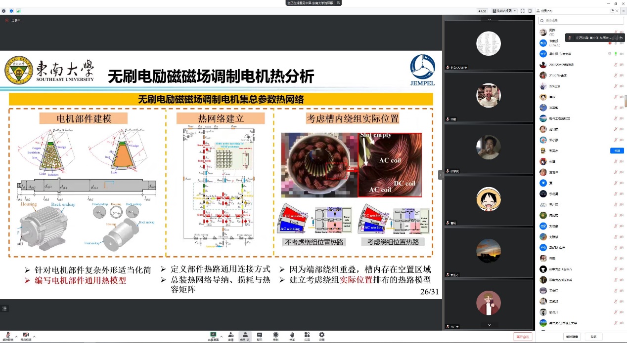 吴中泽教授作了题为《电动汽车用无刷电励磁磁场调制电机研究进展》的学术报告,主要围绕励磁绕组感应脉动电压的机理及其抑制方法、电励磁磁场调制电机电磁热耦合分析进行了介绍。吴中泽教授首先介绍了无刷电励磁磁场调制电机的研究背景;接着以试制的样机为引,介绍了励磁绕组感应脉动电压的机理及其仿真分析方法;然后分别从电机本体侧以及电机控制侧对脉动电压的抑制方法进行了介绍;最后介绍了电励磁磁场调制电机电磁热耦合分析方法以及未来的研究方向。