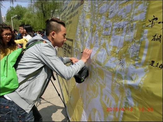 接受完采访后他们在展板上签下自己的名字,随后,工作人员为其送上精心准备的小礼物——华电纪念徽章。