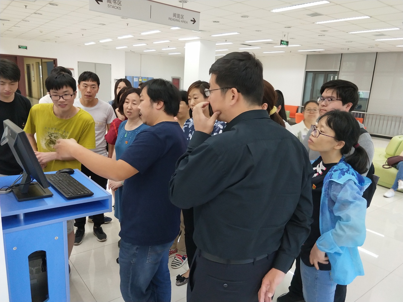 北京农学院图书馆史馆长首先介绍了该馆的基本情况,包括该馆建设理念、馆藏布局、功能定位和服务模式。随后党员们实地走访了北京农学院图书馆的各楼层阅览区,参观了北京农学院图书馆建校60周年图片展览、教职工之家、党员之家。即将开放的幼儿阅览区采用适合低幼儿童的矮书架,摆放的都是适合低龄儿童阅读的崭新绘本,卡通儿童桌椅五颜六色、活泼鲜亮,让人印象深刻。史馆长还带大家一起体验了该馆先进的基于RFID技术的自助借还设备,RFID技术的使用使得图书的排架、盘点和定位工作更加快速,方便书籍的借阅和归还。