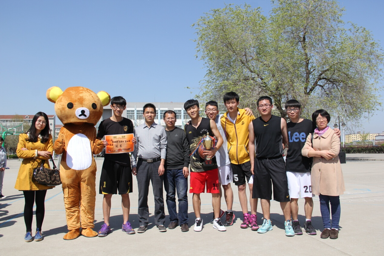 本网保定讯:4月14日中午,经管系篮球赛决赛在三餐旁篮球场精彩结束。大三工商代表队战胜大二造价代表队赢得冠军。经管系党委副书记赵怀璧,团委书记赵吉鹏,辅导员程利敏、敖馨和到场观看并为获胜队伍颁发荣誉证书。