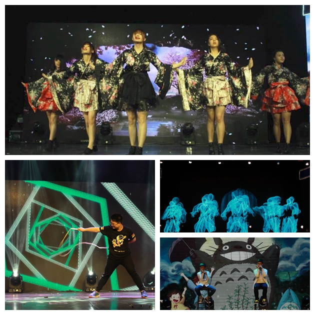 热情的摇滚,紧凑的鼓点,迷音吉他社以“青苹果乐园”和“失恋阵线联盟”绚丽开场,瞬间点燃了现场气氛;中外学生友好交流协会的“拉丁僵尸”带着浓厚的异域风情;紧接着上场的是一笑堂的两位“K歌之王”,逗趣的表演让人忍俊不禁;“魔法回忆”将观众带入魔幻的世界,魔术师灵巧的双手在观众的配合下展现出不一样的魔力;棍起风华,绚烂夺目,双节棍与焰火的结合酷炫帅气,引得满场欢呼;演讲朗诵团带来的“背叛”讲述了一个凄美的爱情故事,背叛的是爱情,没有背叛的是革命;B-Box社的“Check It Out For Hiphop”将B-Box与舞蹈结合,更具别样的风采;由兄弟学校带来的“爱情三十六计”灵动飘逸,“跆风”气势不凡,让人眼前一亮;SAYing动漫社则带来了“极乐净土”,动人的舞步引发台下一片欢呼;绳彩飞扬,跳跃青春,花式跳绳让人目不暇接;Golden Melody口琴社奏起宫崎骏组曲,熟悉的旋律,童年的回忆,令人不禁感动落泪;摩登舞“暮光之城”灵动优雅,款款情深;最后上场的是“曹尼历险记”,社团中的苦辣酸甜,都化作动感的舞蹈精彩呈现。