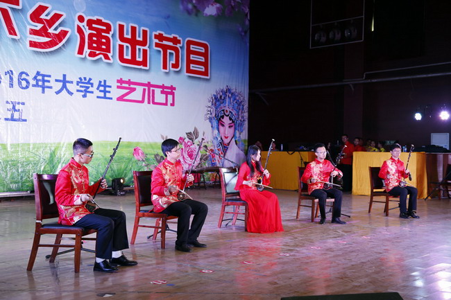 紧接着是路伟带来男声独唱《多情的土地》,浑厚的嗓音,唱出一片拳拳深情;寒风猎猎、铁骑阵阵,民乐团同学带来的笛子独奏《塞上铁骑》令人赞叹,短小的笛子,在娴熟的指法运用之下音色灵活多变,表演者气息张弛自如,将铁骑者骁勇的英姿用欢快的乐章生动呈现;伴着幽静的箫声,民乐小合奏《月下扫塔》如月光倾洒在微起涟漪的湖面上,整首曲子轻柔悠缓,如泣如诉、如怨如慕;吴乐为带来的男声独唱《儿行千里》,演唱细腻真实,情真意切,富有现场感染力;男声四重唱的曲目是河北当地民歌《回娘家》, “左手一只鸡,右手一只鸭,身上还背着一个胖娃娃呀”,充满民趣的歌曲在四位老师默契配合下,情意甚浓。