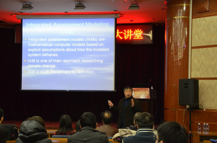 首先,杨教授对气候变化综合评估模型(IAMS)做了一些定义,原理,任务等方面的说明和解释。IAMS是一种基于明确的假定表现模型系统的数字建模,也是一种主要的研究气候变化的方法。它具有模型应具有的透明度和可移植性。它的任务或者说功效主要有模拟出一种未来可能发生的情况,预测未来化石燃料的供给与需求,综合评估出一种减轻温室气体排放的成本效益最优的方式以及对气候变化的影响。