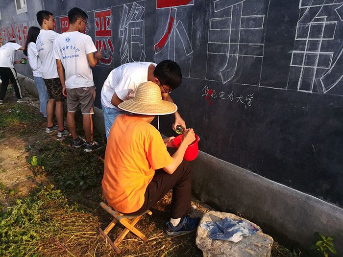 当日下午,实践团来到北坡地,在工作队宋雨教授的指导下完成扫黑办的标语绘制工作。通过实践,队员们意识到自己低估了任务难度,不禁对基层干部肃然起敬。尽管工作完成得较为粗糙,实践团的努力还是受到了宋教授与村民们的赞扬,极大地鼓舞了队员的工作热情。