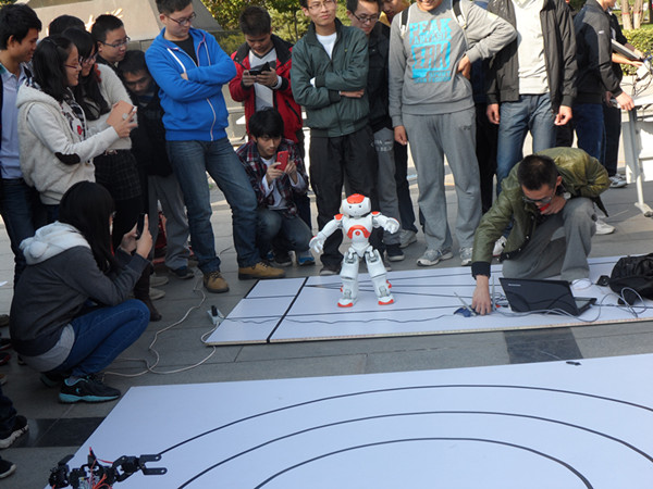 在江南Style的欢快旋律中,自动化系韩露正在向围观的同学们展示如何操作NAO机器人。有着酷似人体造型的它,拥有两块单片机,一块控制所有舵机;另一块用于传感、编辑和储存程序,从而可以实现语音视频、舞蹈表演、图像识别、语音对话、播放音乐等多项智能指挥功能。在展示舞蹈技能时,NAO跳着风靡一时的骑马舞,双臂高举、挥动、高低旋转,一会儿左弓步,一会儿又屈膝摇摆,步步和着音乐节奏。除此之外,NAO 还展示了太极拳。音乐由激昂过渡到柔和,NAO缓缓伸出手臂,分别向左右两个方向侧弯腰,两足踏地,同时双腿保持马步姿势。表演引得众多同学驻足观看,并纷纷拿出手机争先拍照,有的同学还饶有兴致的实地学习操作过程,展览操作区热闹非凡。