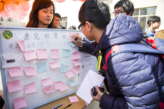 该协会举办此次活动,吸引大量的学生在宣传板上写出了他们对学校工作的感想、对学校建设的希冀,承载着他们恳切的寄语,将五色便贴纸贴满了整个宣传板。而学校信息化建设与管理办公室的各位负责老师更是亲自来到活动现场,与现场学生进行交流,了解学生对学校信息化建设的想法及提出的建议和需求。同时,现场很多参与者纷纷通过扫描校信通“二维码”、微信“摇一摇”等形式参加活动中来,2名幸运同学获得“小米Wi-Fi U盘”奖品,将活动的气氛推向高潮。
